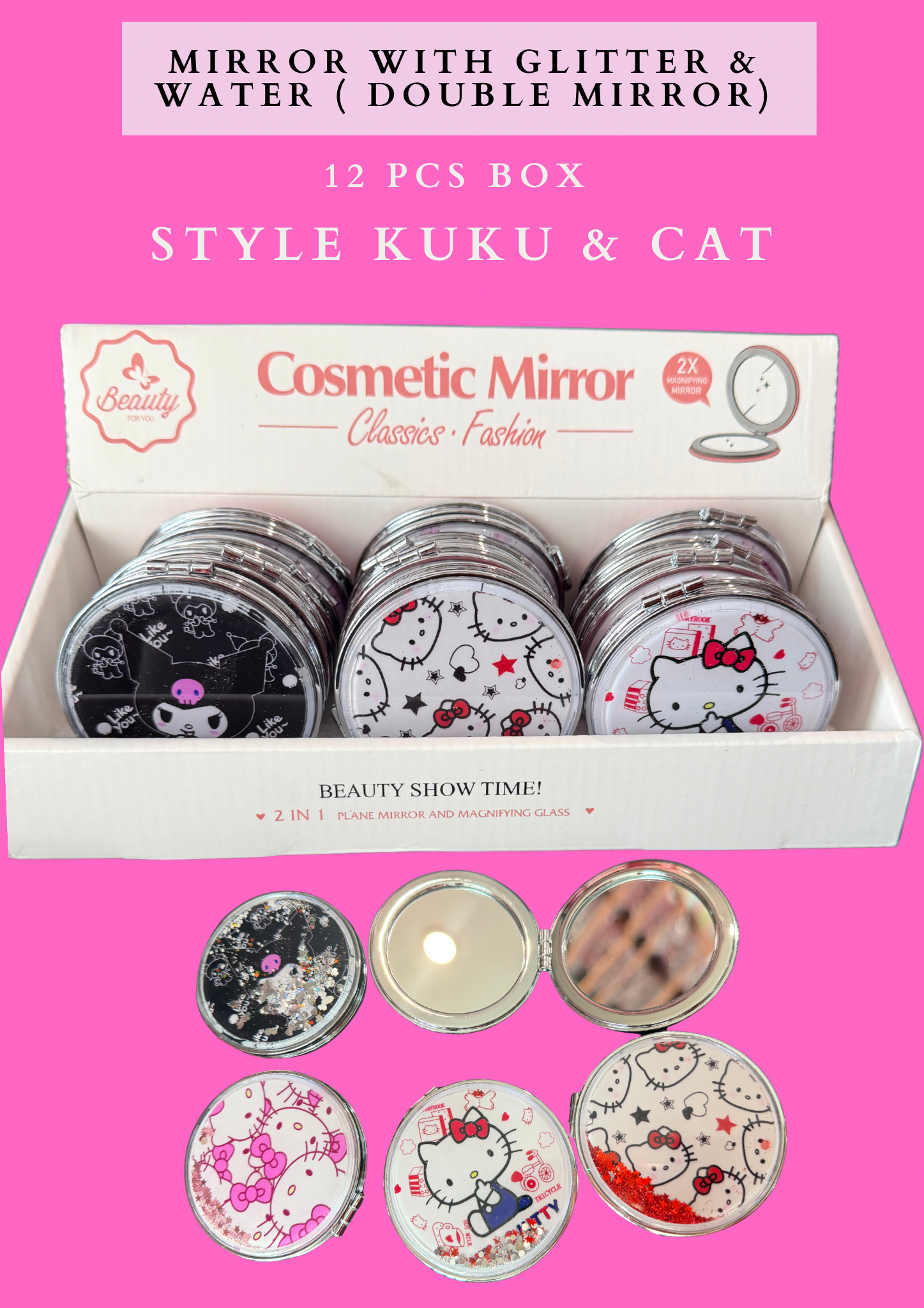 MIRROR WITH GLITTER & WATER (DOUBLE MIRROR) 12 PCS BOX - STYLE KUKU & CAT