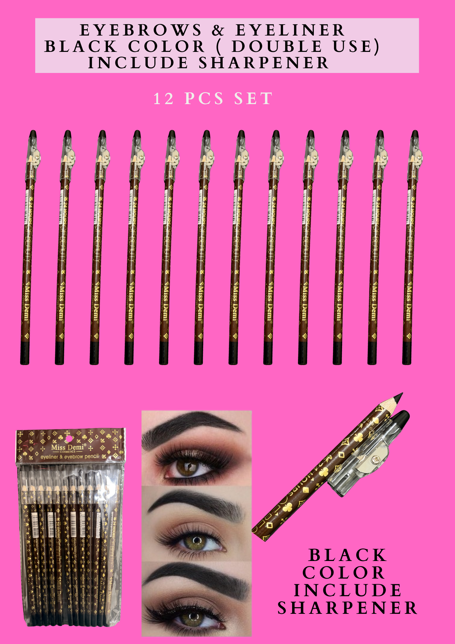 EYEBROWS & EYELINER BLACK COLOR (DOUBLE USE) INCLUDE SHARPENER 12 PCS SET